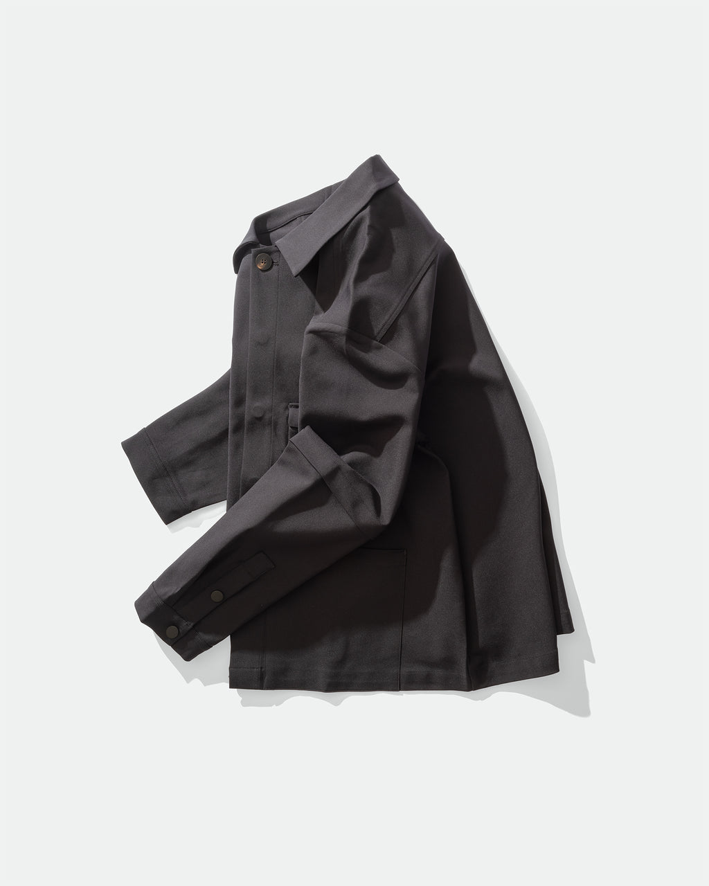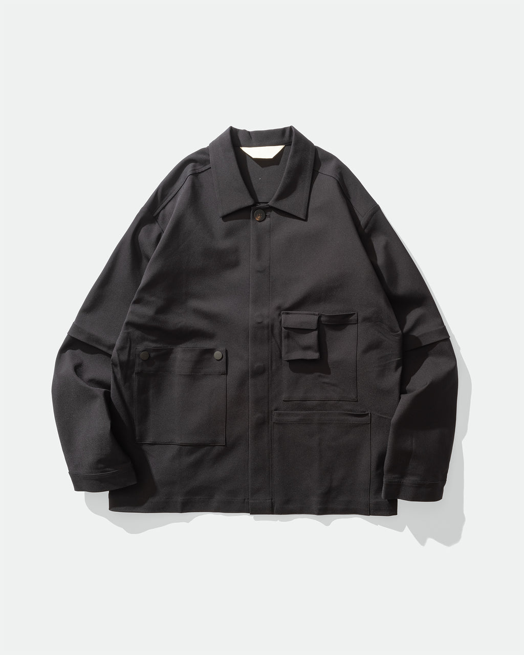 GRAYE focuses on versatility and functionality, blending subtle technical details into easy-to-wear, unisex styles. The Utility Workwear Jacket is made from a durable cotton-nylon-spandex blend, offering boxy structure with added stretch. Designed with multiple front pockets, a metal snap button closure, and faux layered sleeves complete with placket and cuff detailing.