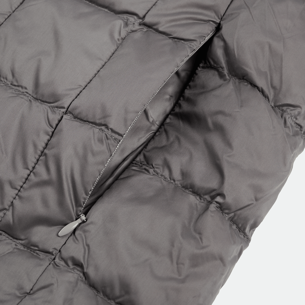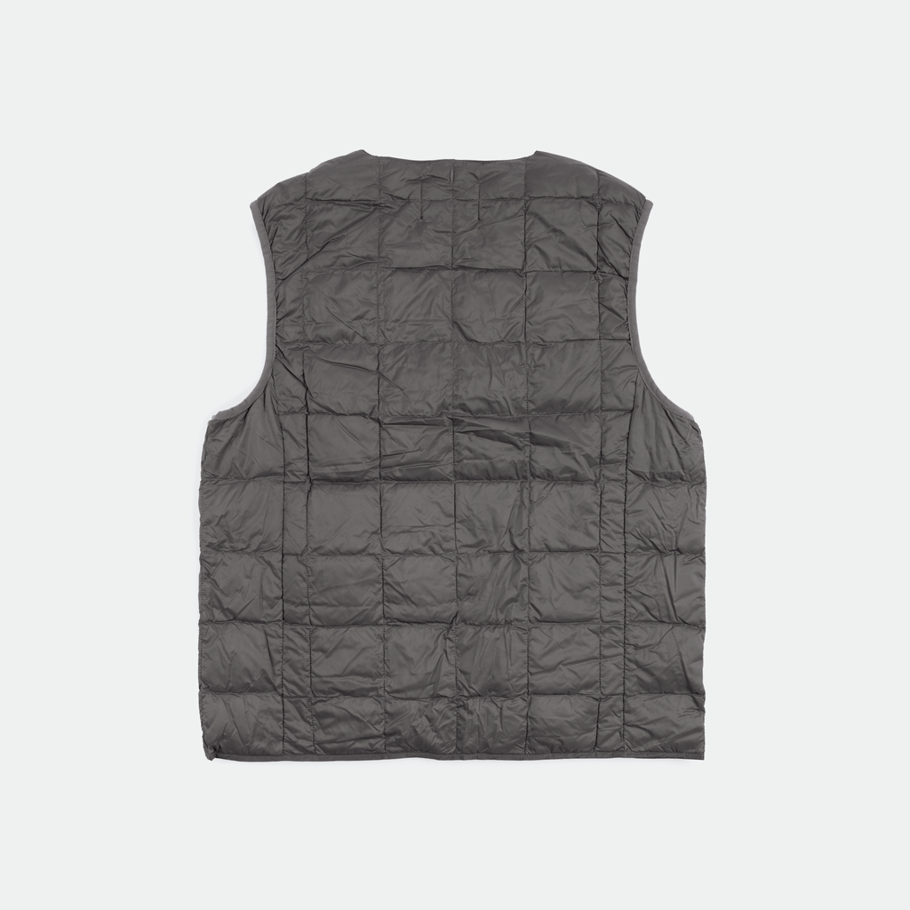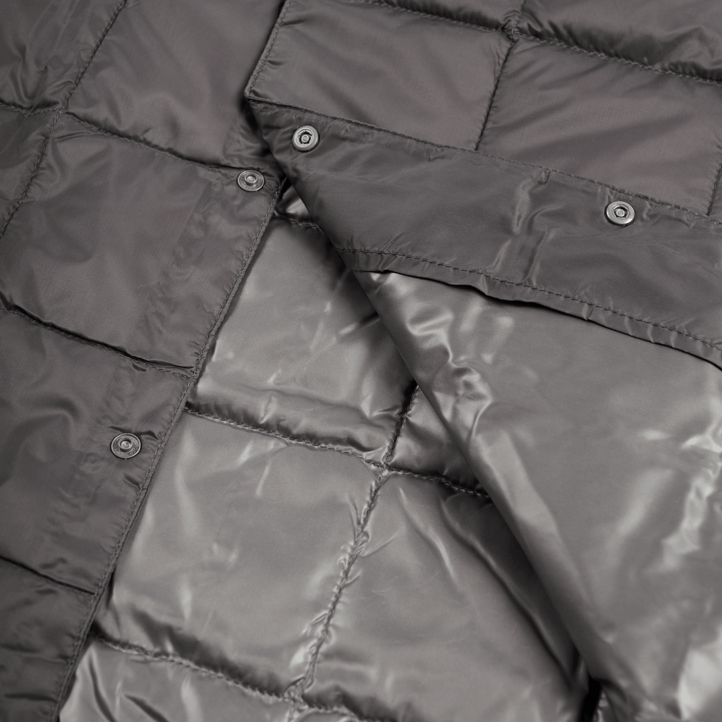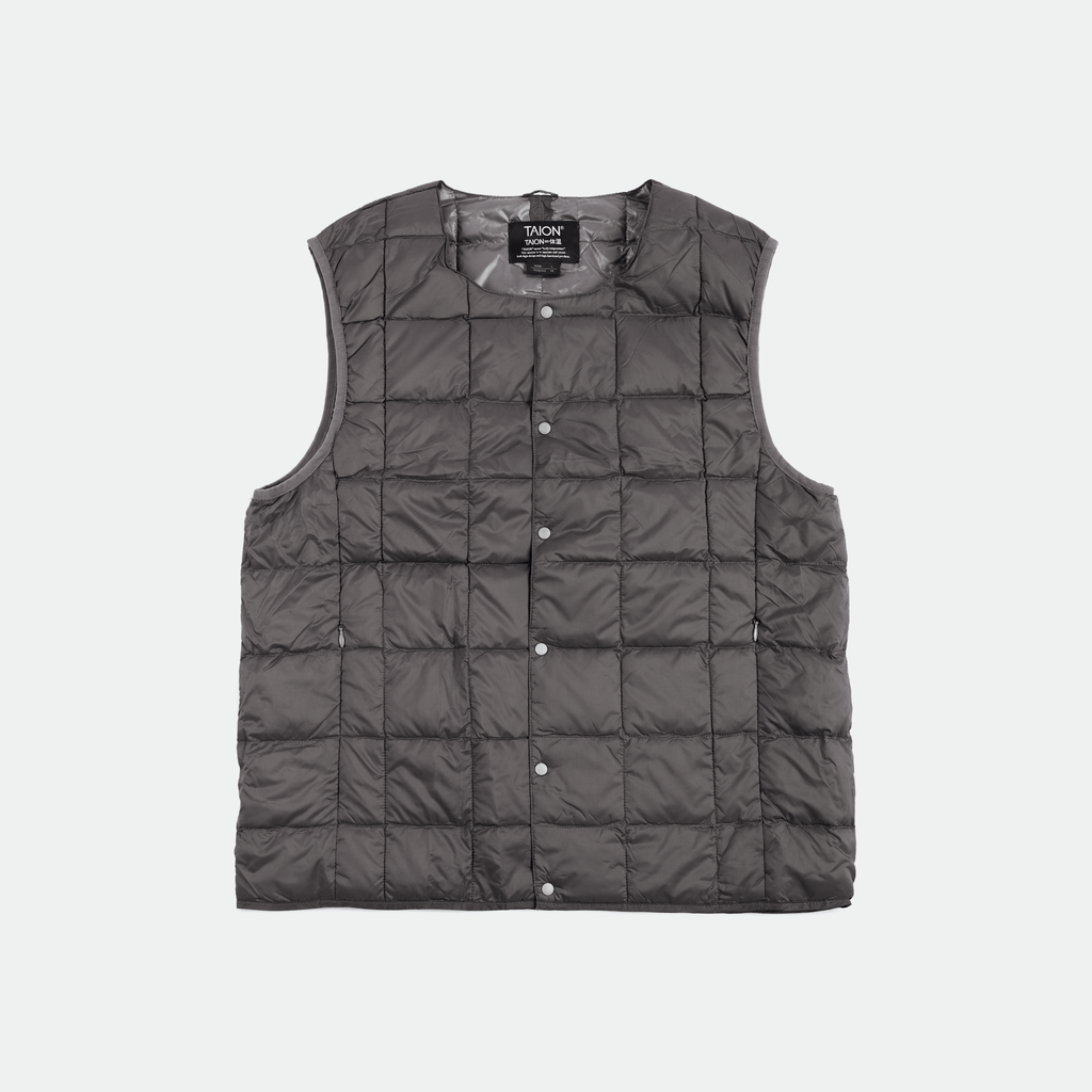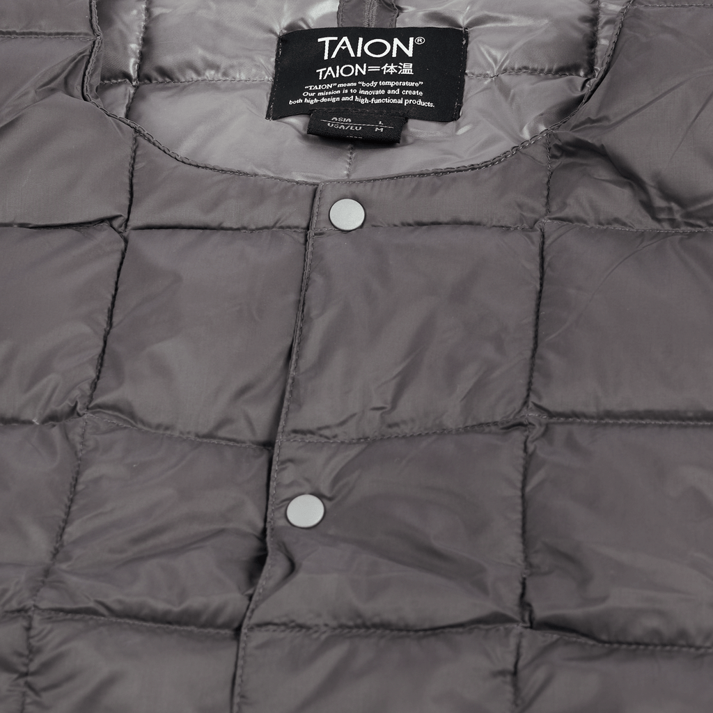 The Grey Crewneck Button Down Vest by TAION combines insulated down with versatile styling, featuring a snap-button closure and discreet zip pockets at the waist. Made from lightweight, padded down-filled fabrics with a water-repellent nylon shell, it’s perfect for layering and packs compactly into a drawstring pouch. Unmatched warmth, ideal for your winter wardrobe rotation.