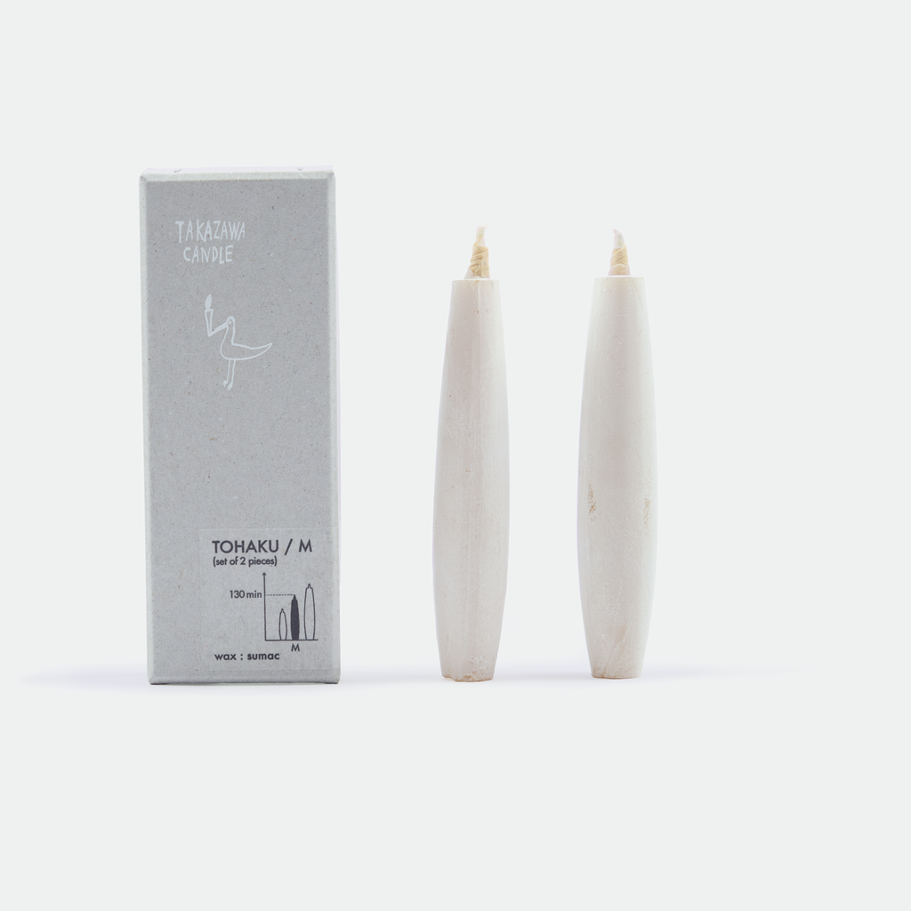 The TOHAKU set by TAKAZAWA CANDLE is crafted from plant-based Sumac wax. TOHAKU is homeage to 'The Pine Trees screen', drawn by Tohaku Hasegawa, one of the most famous painters in Japan. The flame is an extension of the gentle lines of trees in his paintings reminiscing a rustic simplicity.